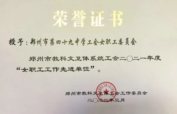 近日,从郑州市总工会传来喜讯,郑州四十九中荣获“郑州市教科文卫体系统工会女职工工作先进单位”荣誉称号。