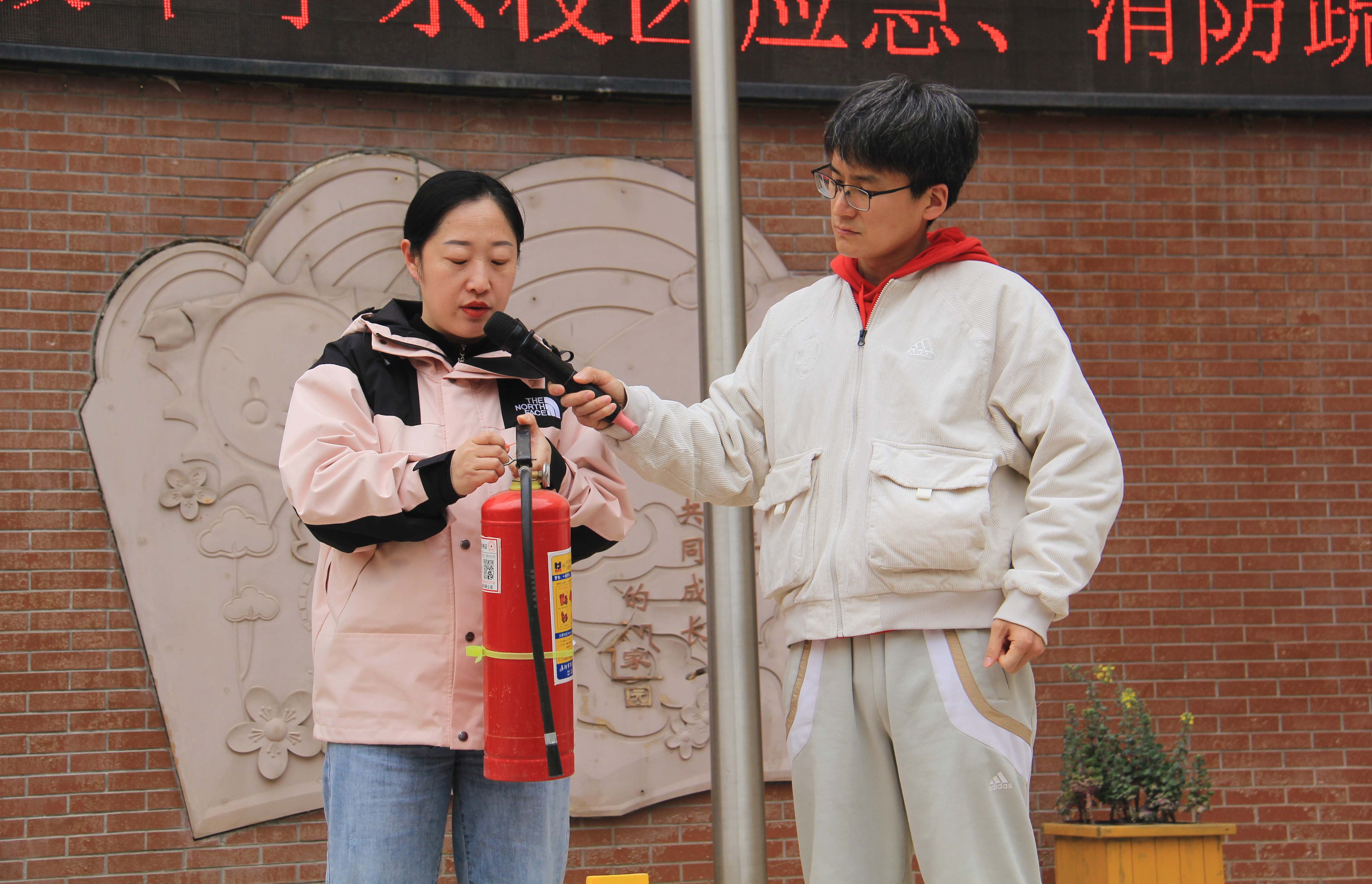 学生到达操场后,我校总务处张琳娟主任分别从身边起火,本层起火、楼上起火、楼下起火以及如何正确逃生给同学们做了详细讲解,随后又对灭火器的正确使用进行了操作演练。