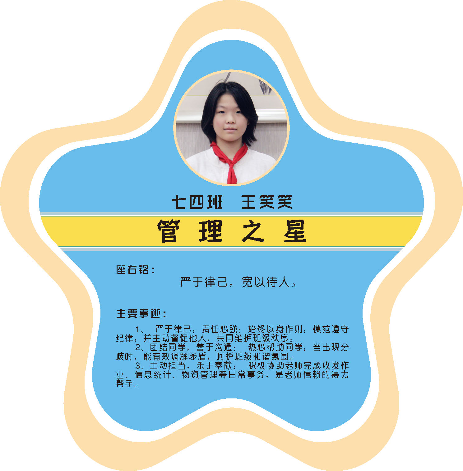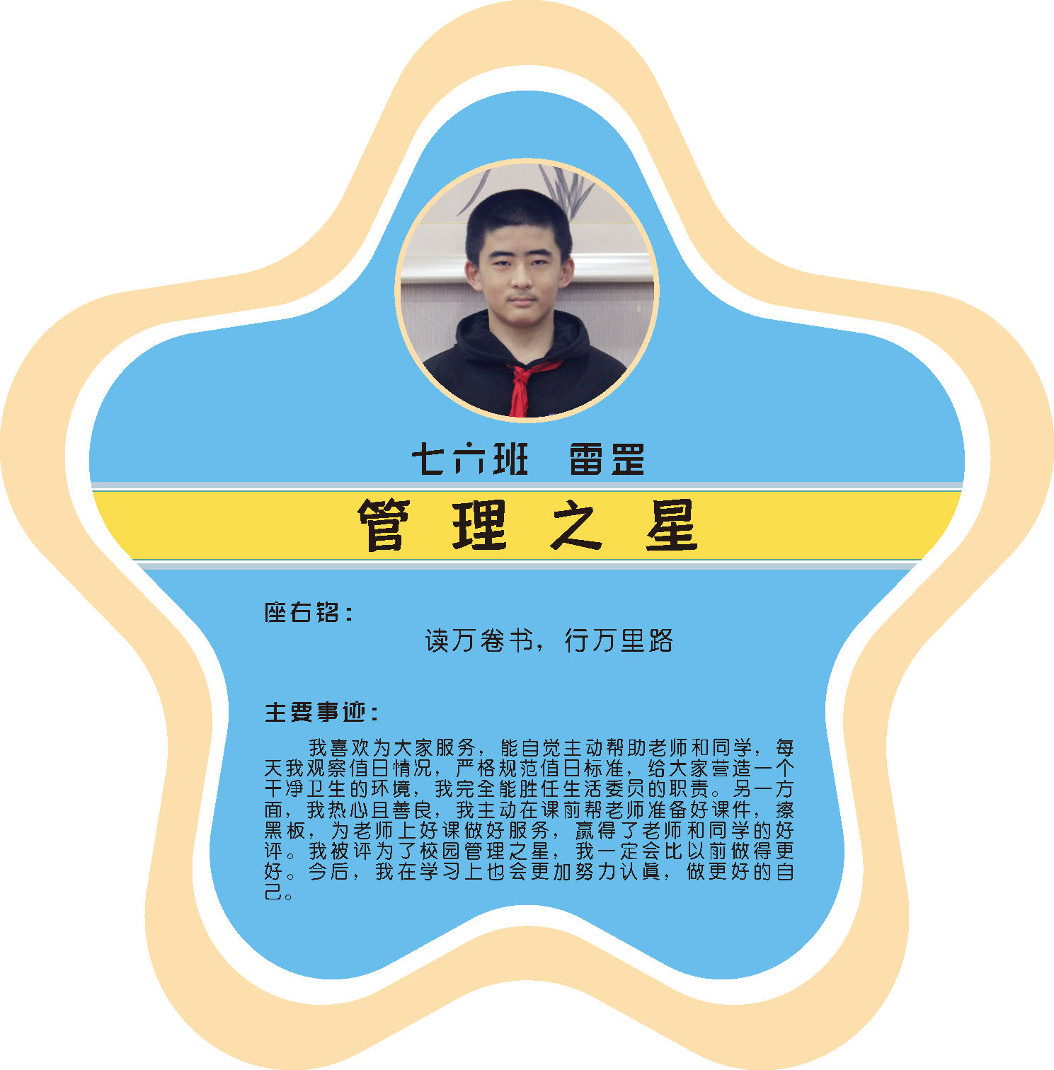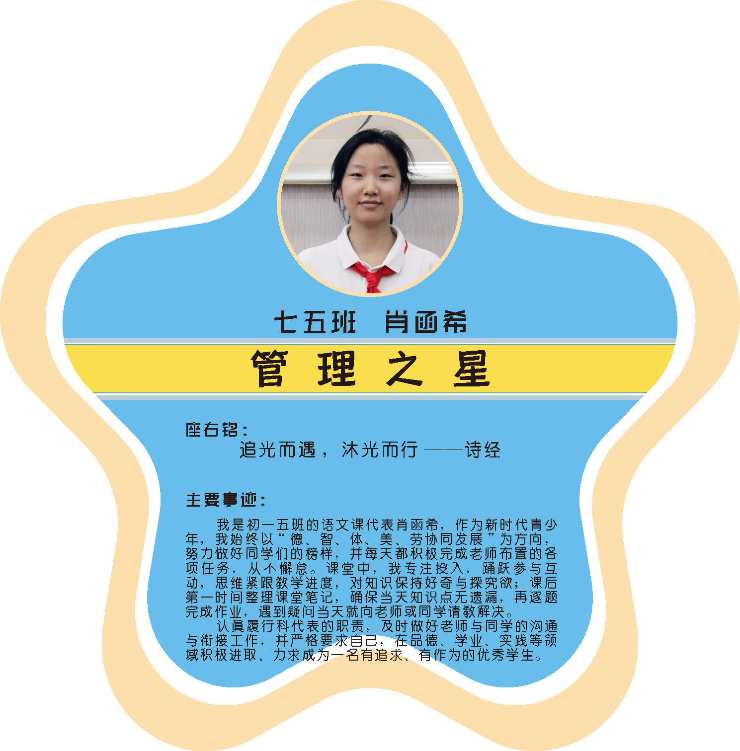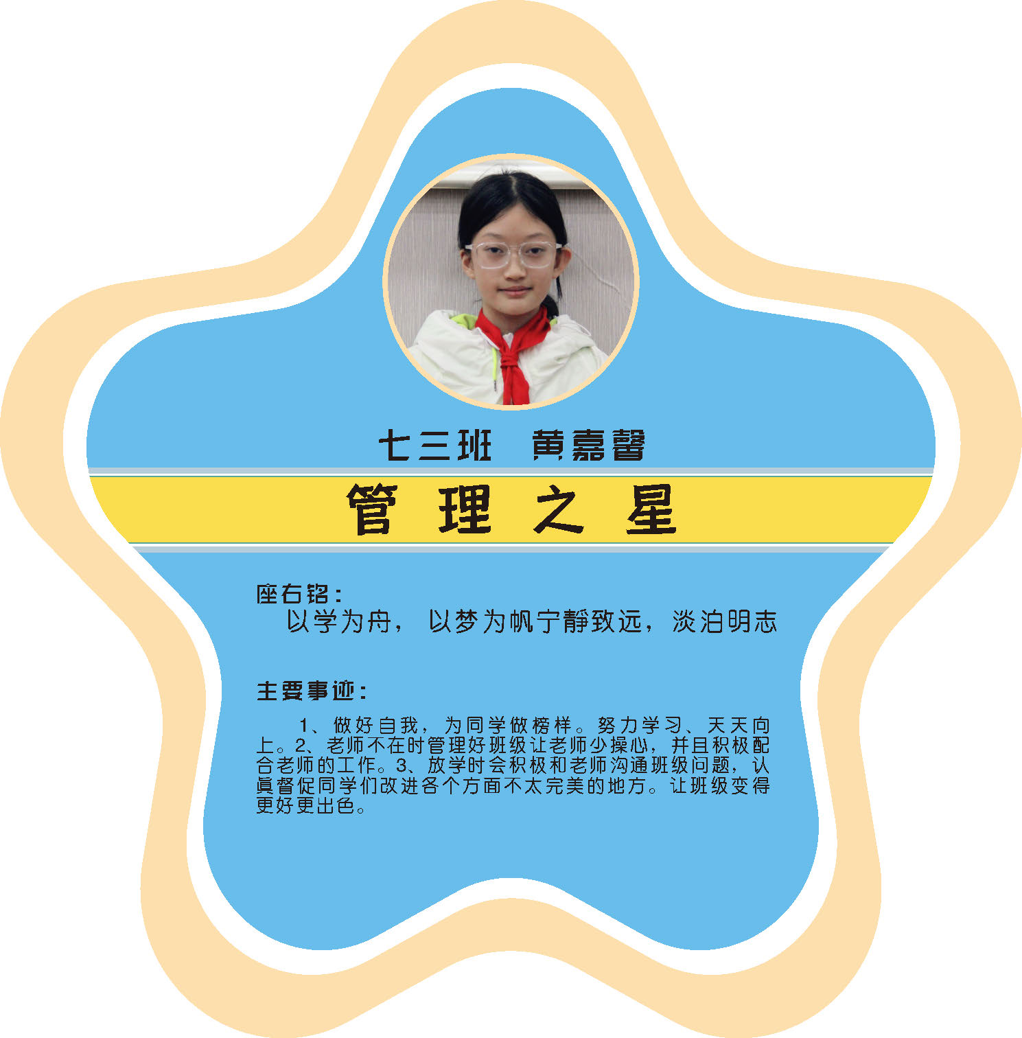 本期校园之星主题为“点亮平凡生活的微光”,他们或许来自不同年级,却同样以行动点亮平凡日常。结合学生日常行为表现,评选出年级之星、学习之星、勤奋之星、管理之星、自律之星、志愿服务之星、文艺之星、劳动之星、纪律之星。这些来自校园各领域的‘微光’,汇聚成榜样的星河,这就是本期校园之星们。
