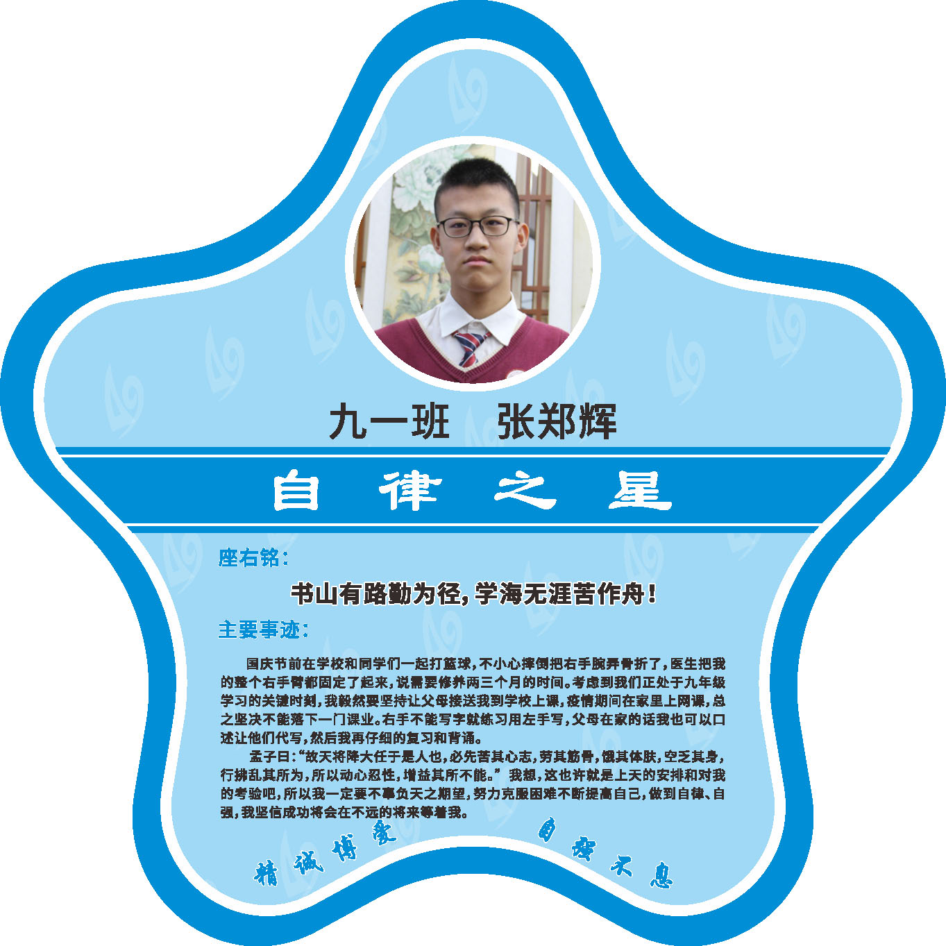 有明确的居家学习生活计划,并严格执行。认真有效的预习、 听课、复习,按时完成各项作业,合理使用电子设备,每天坚持阅读和体育锻炼。生活积极乐观,承担力所能及的家务,有自己的一项兴趣爱好,并为之付出努力。现经个人申报,班级推荐,学校审核,评选出2022年10月《自律之星》。