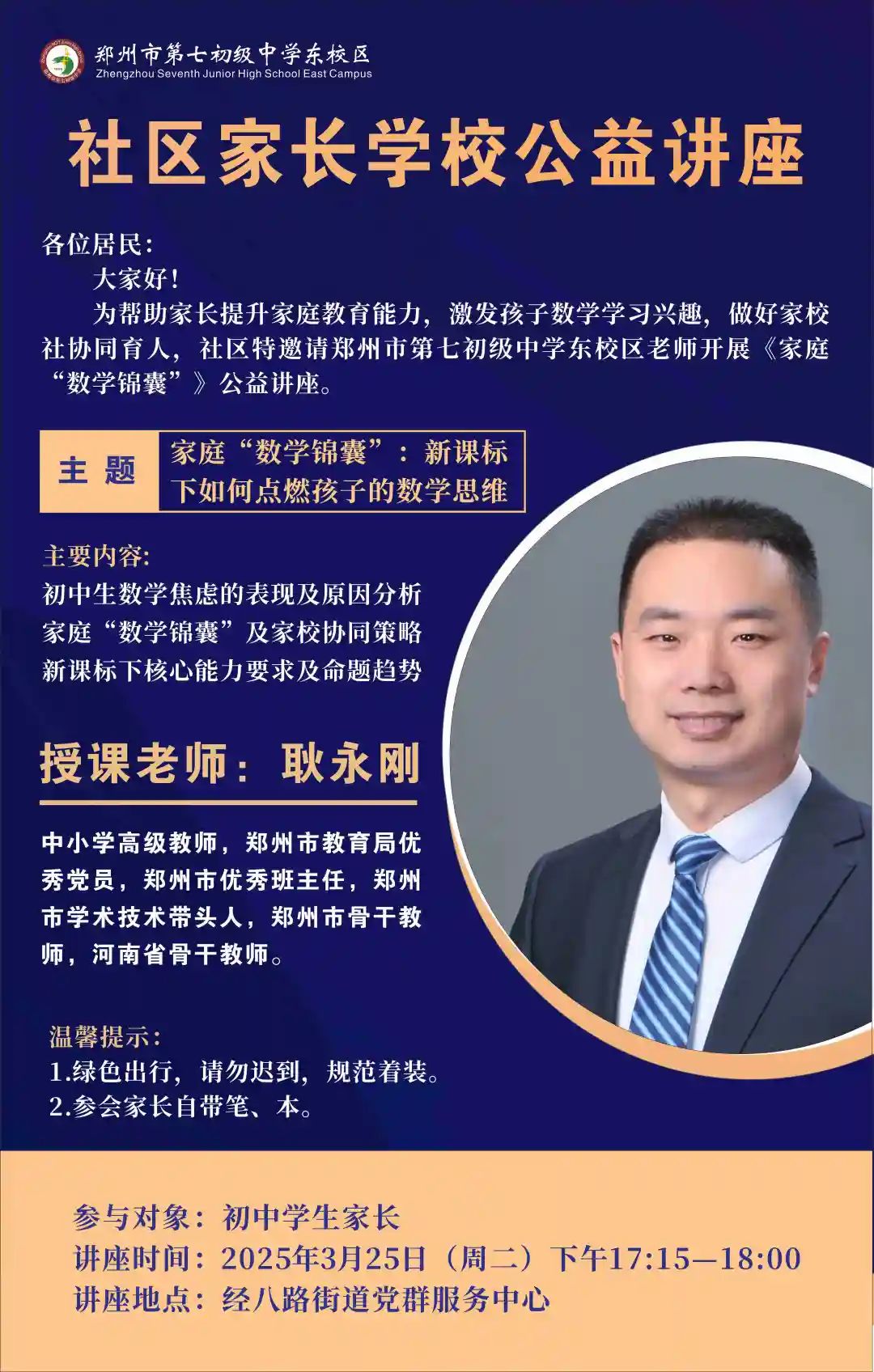 3月25日,郑州市第七初级中学东校区举办了一场以“新课标下如何点燃孩子的数学思维”为主题的社区家长学校公益讲座,旨在助力家长提升家庭教育能力,激发孩子数学学习兴趣,做好家校协同育人。七初东校区副校长徐光辉、七年级部分教师及学生家长参与此次活动。讲座由七初东校区七一班班主任耿永刚老师主讲。