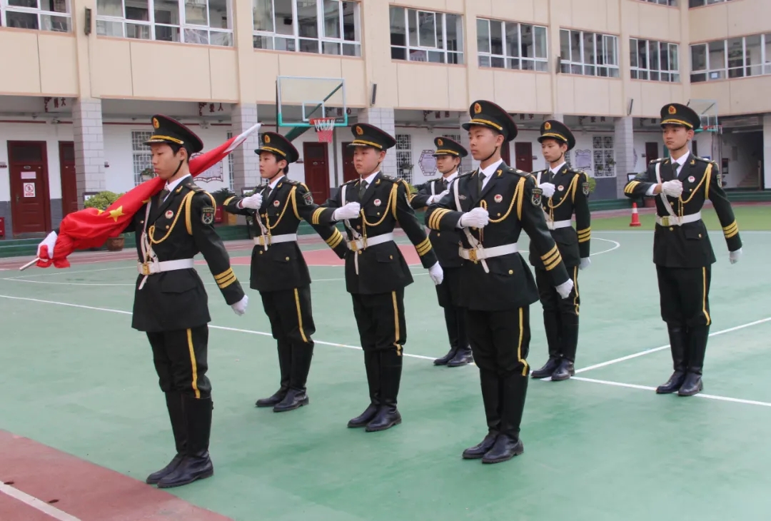 为了走出国旗班的气势,队员们在日常训练中严格自我要求,站姿、转法、齐步、正步、跑步、敬礼、摆臂等,每个动作重复数遍。汗水浸湿了衣服,最终,他们在周一的升旗仪式中完美亮相,受到学校、家长和同学们的一致好评。