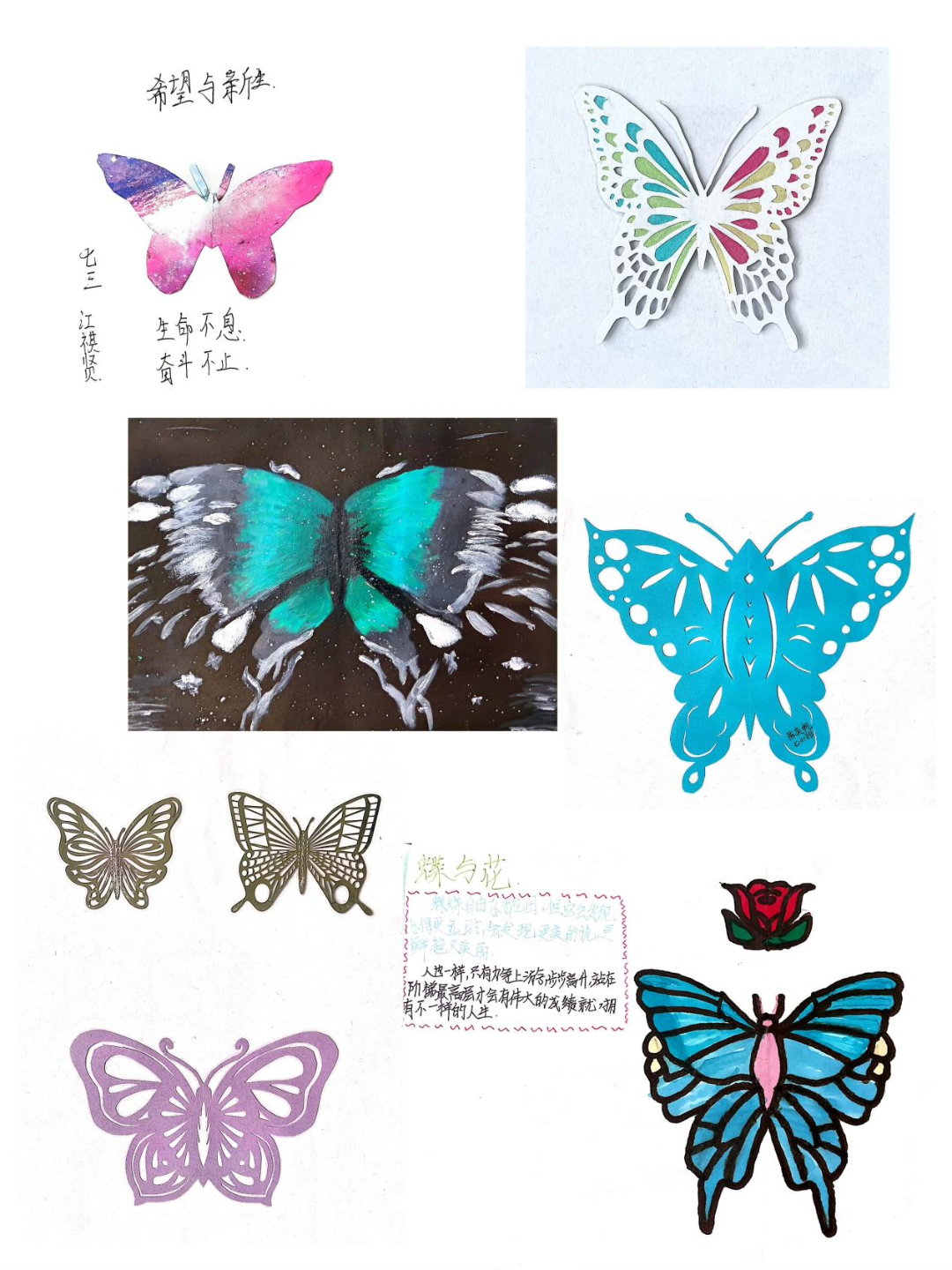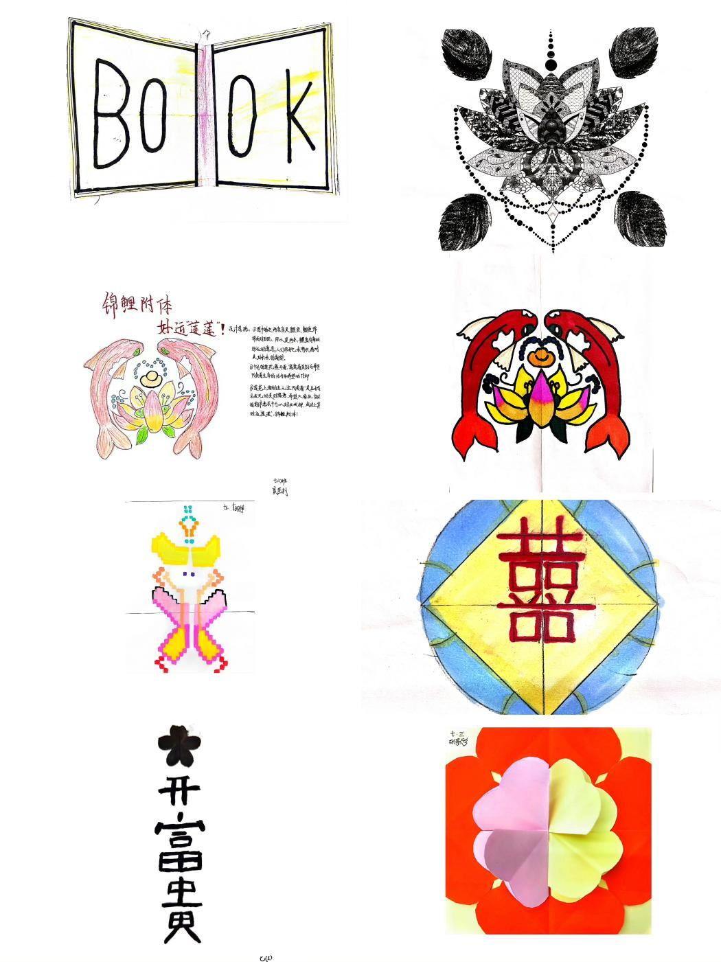 同学们统一把作品上交后,七年级数学备课组组织老师进行评选工作,最终一大批优秀作品脱颖而出。以下是本次七年级“轴对称作品设计”大赛部分优秀作品: