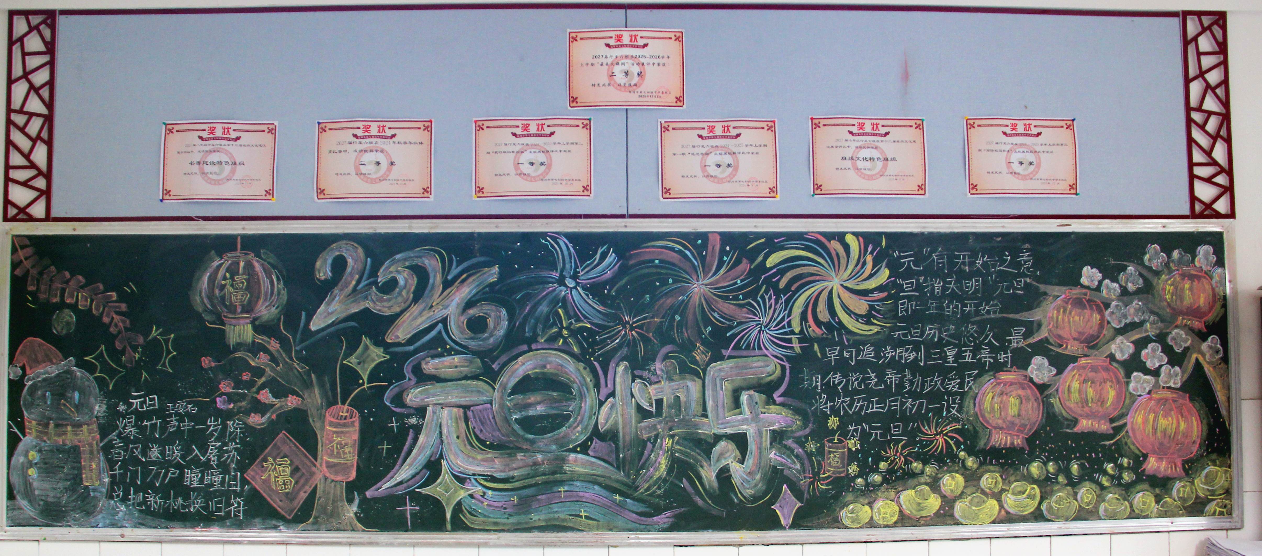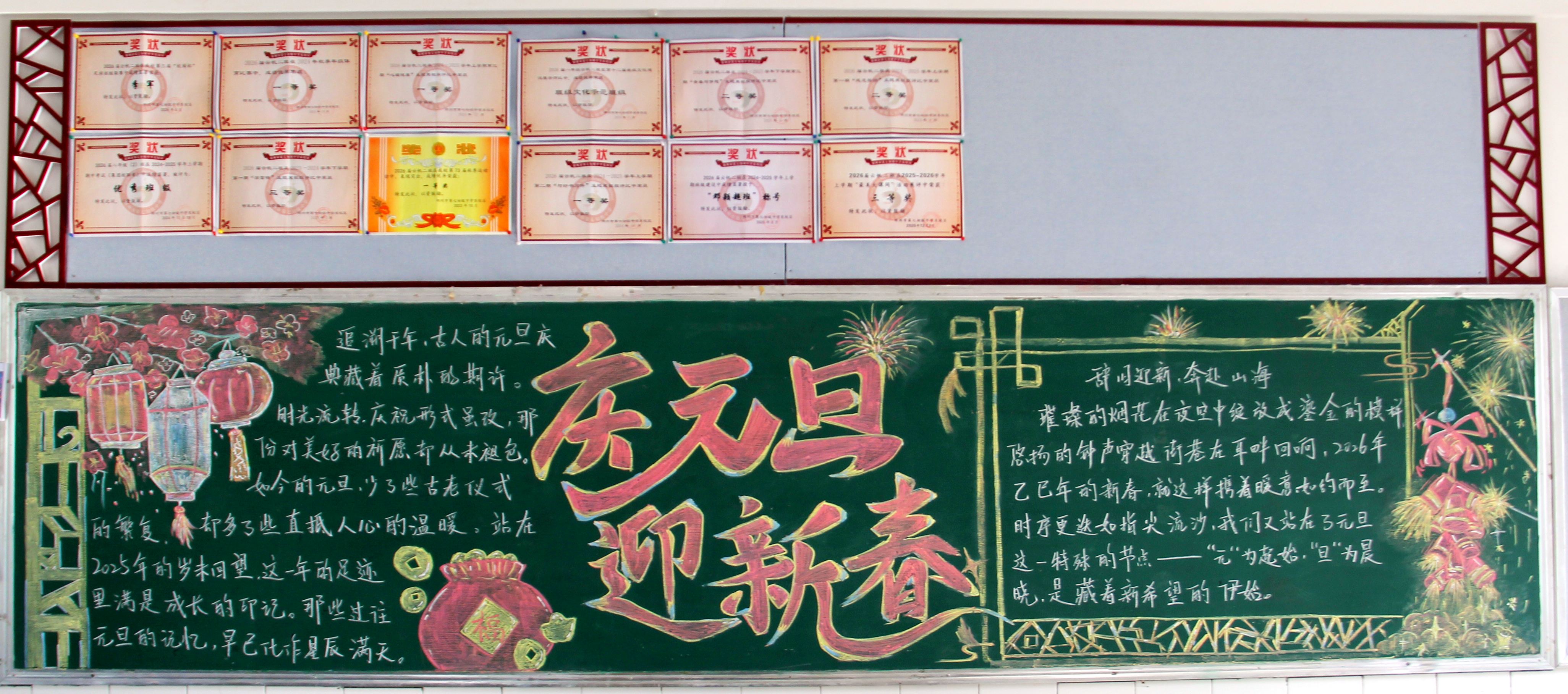 12月26日,各年级围绕 "惜时 迎新" 为主题,精心创作黑板报,用创意与巧思勾勒出一幅幅校园文化画卷。