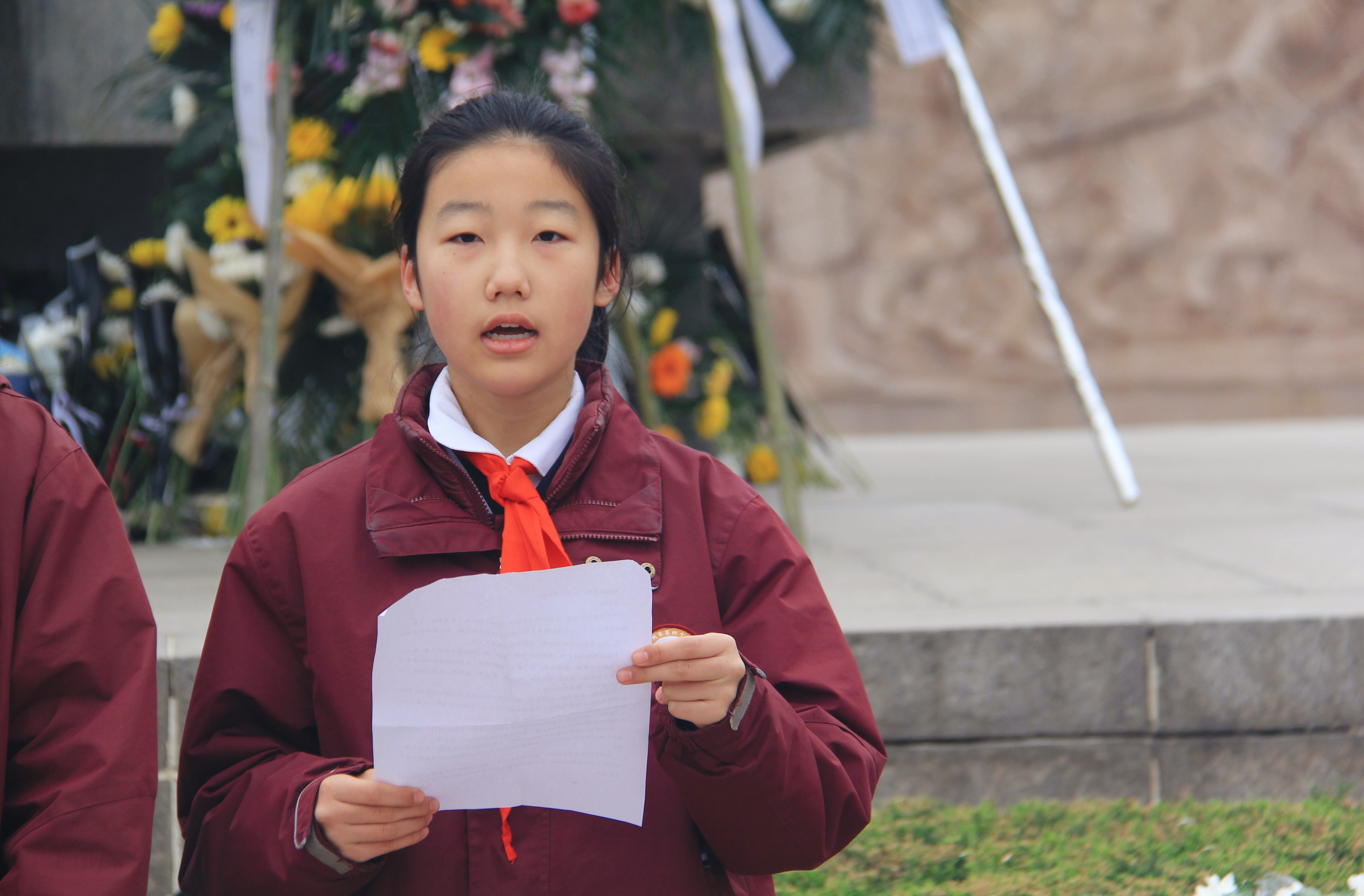 教师代表和同学们一起深深鞠躬致敬,杨婉琪同学在发言中深情说到,先烈们用自己的鲜血染红了国旗的颜色,用自己的身躯筑起了万里长城,我们一定会继承先烈们的遗志,珍惜宝贵的时间,感恩美好的现在,用我们的智慧和勤奋去完成新时代赋予我们的神圣使命,让长眠在陵园里的革命先烈更加欣慰,让伟大的祖国更加富强,把新中国建设得更加繁荣和富强!