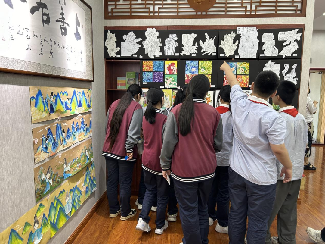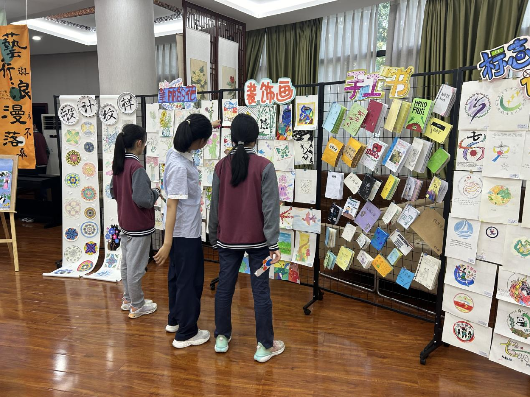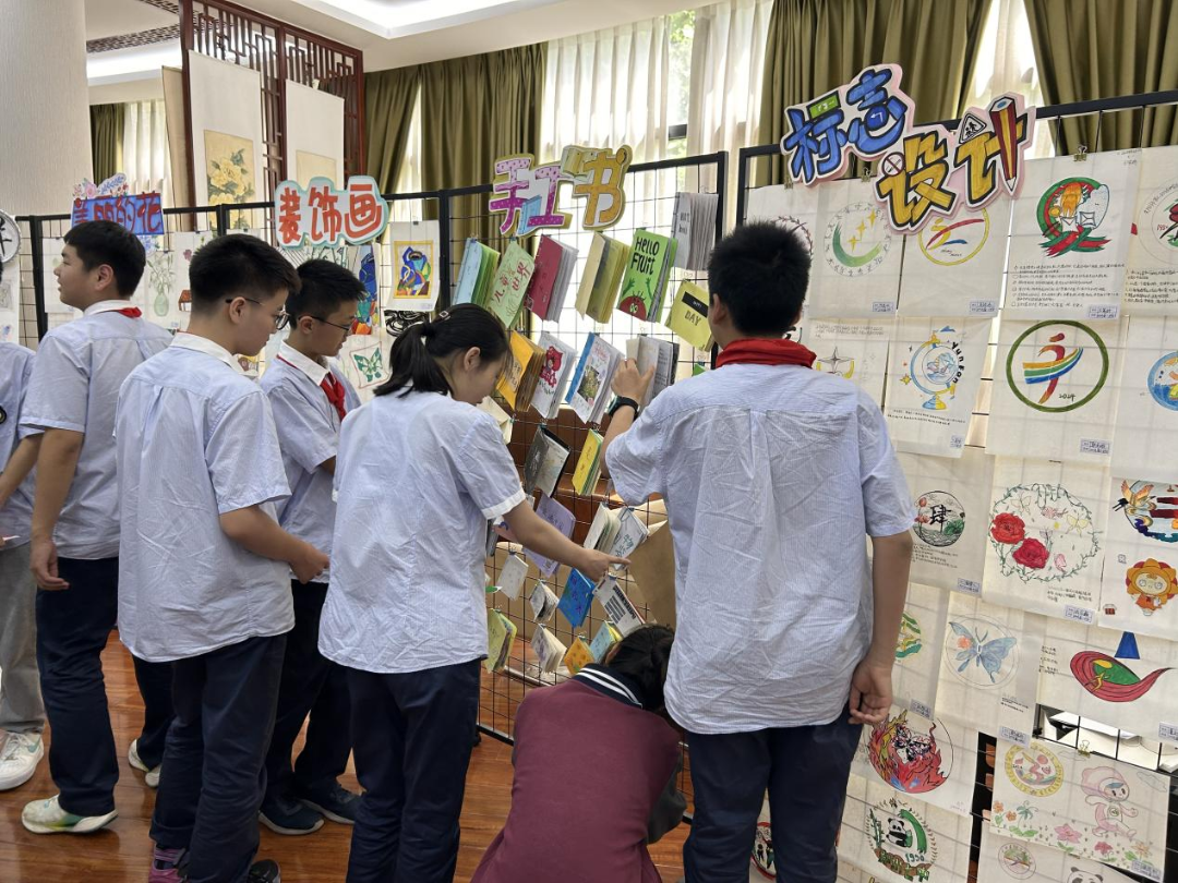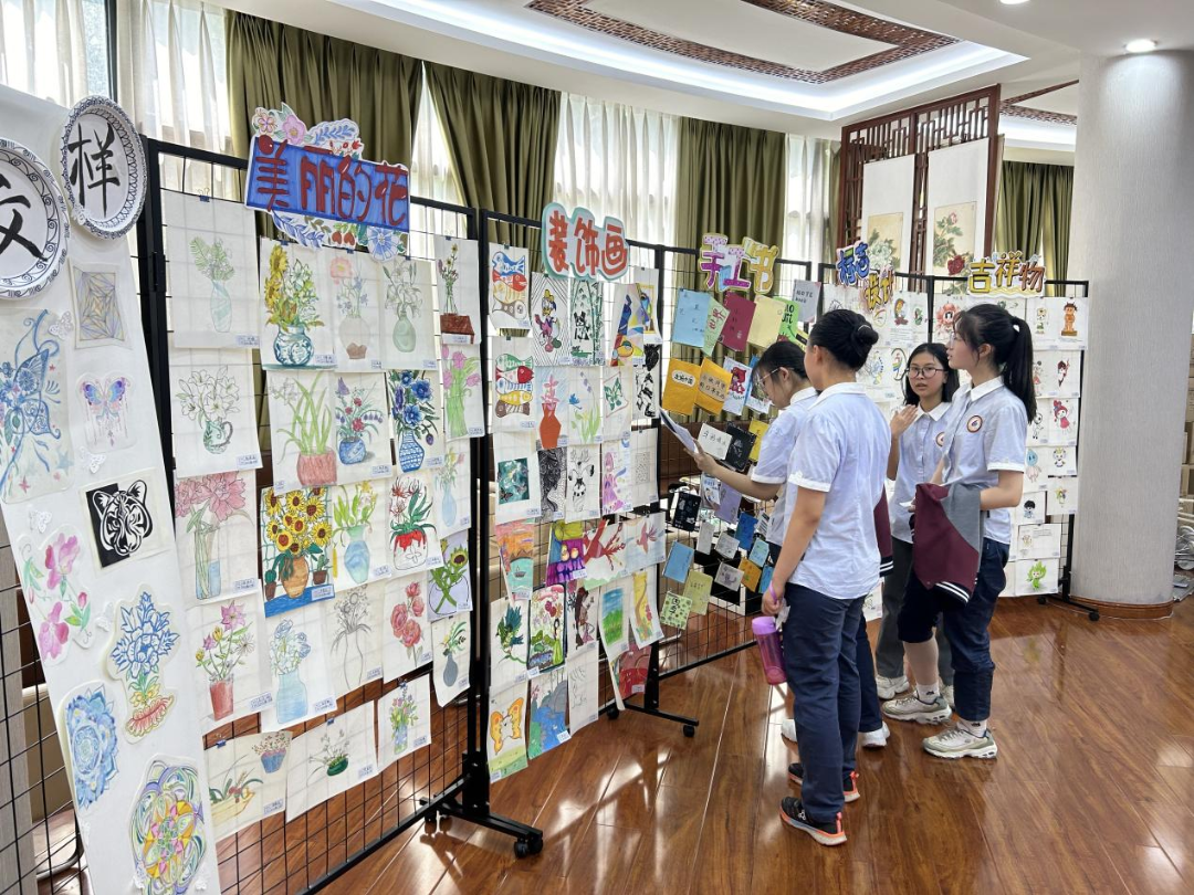 其中美术展示区涉及12个主题,学生们用创意和热情诠释了活动的主题。学生们亲手制作的手工书,每一本都凝聚了他们的心血和创意,从封面到内页都散发着独特的光芒。纹样设计作品则展示了学生们对线条和色彩的精妙运用,从简约的几何图形到复杂的民族图案,都展现了他们对美的追求和向往。春日盛会更是让人眼前一亮。学生们用画笔捕捉春天的气息,将生机勃勃的春天景象呈现在画布上。他们笔下的花朵盛开,树木翠绿,小鸟欢鸣,仿佛让人置身于春天的怀抱中,感受到了生命的力量和希望。标志设计和吉祥物设计展则展现了学生们的创新思维和实践能力。他们设计的标志简洁大方,寓意深刻;吉祥物形象可爱,富有亲和力。这些作品不仅体现了学生们的艺术天赋,也展示了他们对学校文化的理解和热爱。