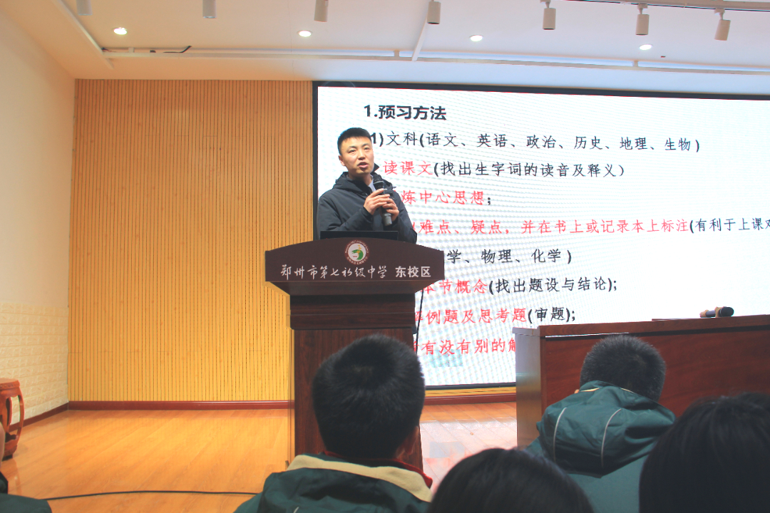 11月25日,郑州市第七初级中学东校区七年级召开学习经验交流会。七初东校区党支部书记楚东升、副校长徐光辉、七年级年级主任程琳及七年级全体学生参加此次交流会。