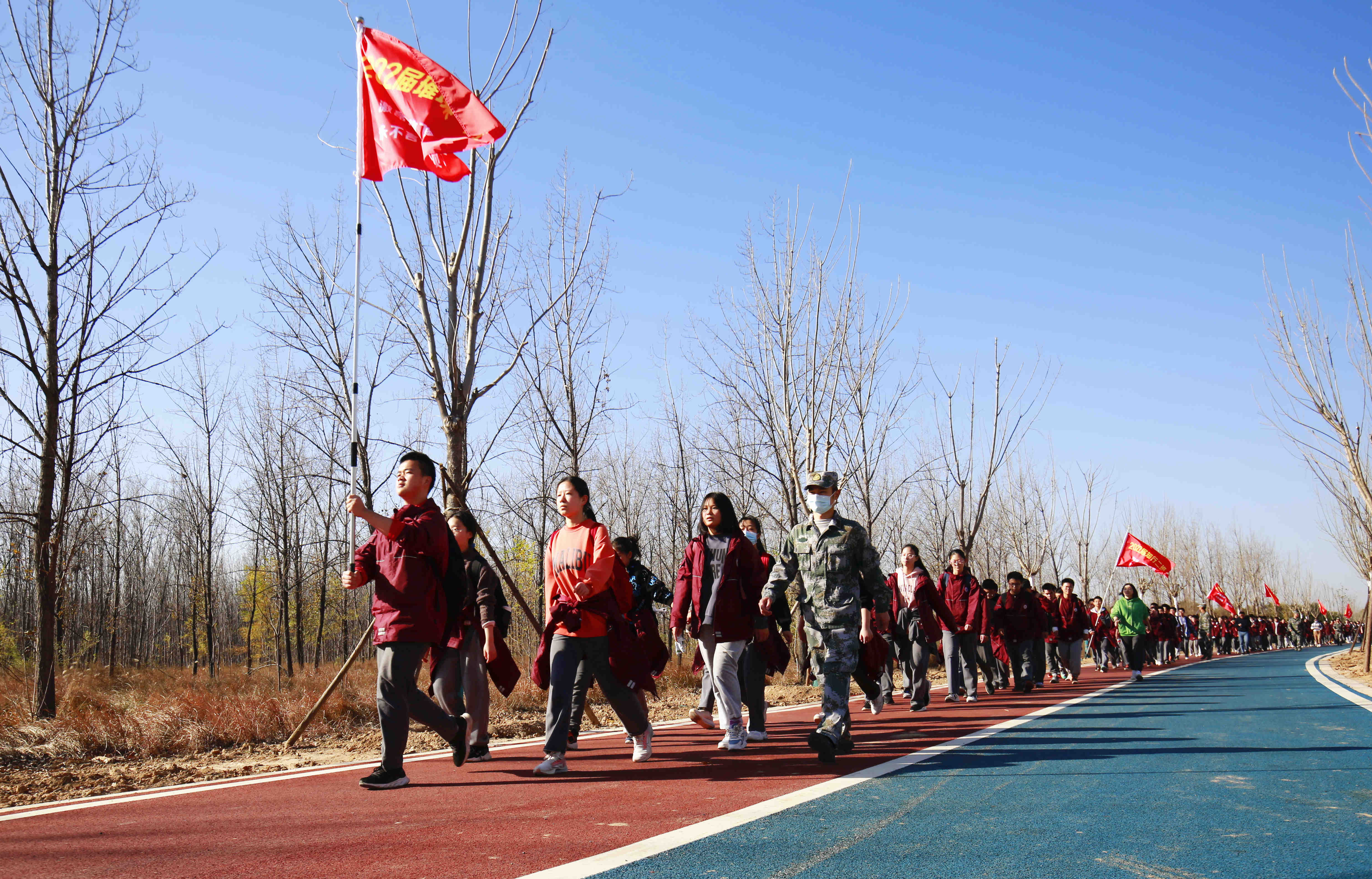 早上7点,九年级师生在校操场举行动员仪式,拓展教官为各班授旗,年级组长彭建杰做动员讲话。为确保交通安全,学生统一乘大巴车抵达出发点,江山路健康步道,在班主任老师和教官的共同组织下,同学们开始徒步拉练。一路上,耀眼的旗帜迎风飞扬;一路上,远足的队伍欢快高歌;一路上,师生的步伐从未停歇。虽然衣襟湿透,甚至脚掌起泡,但一张张青春的脸庞,一个个灿烂的笑容,不言畏惧,不言放弃。