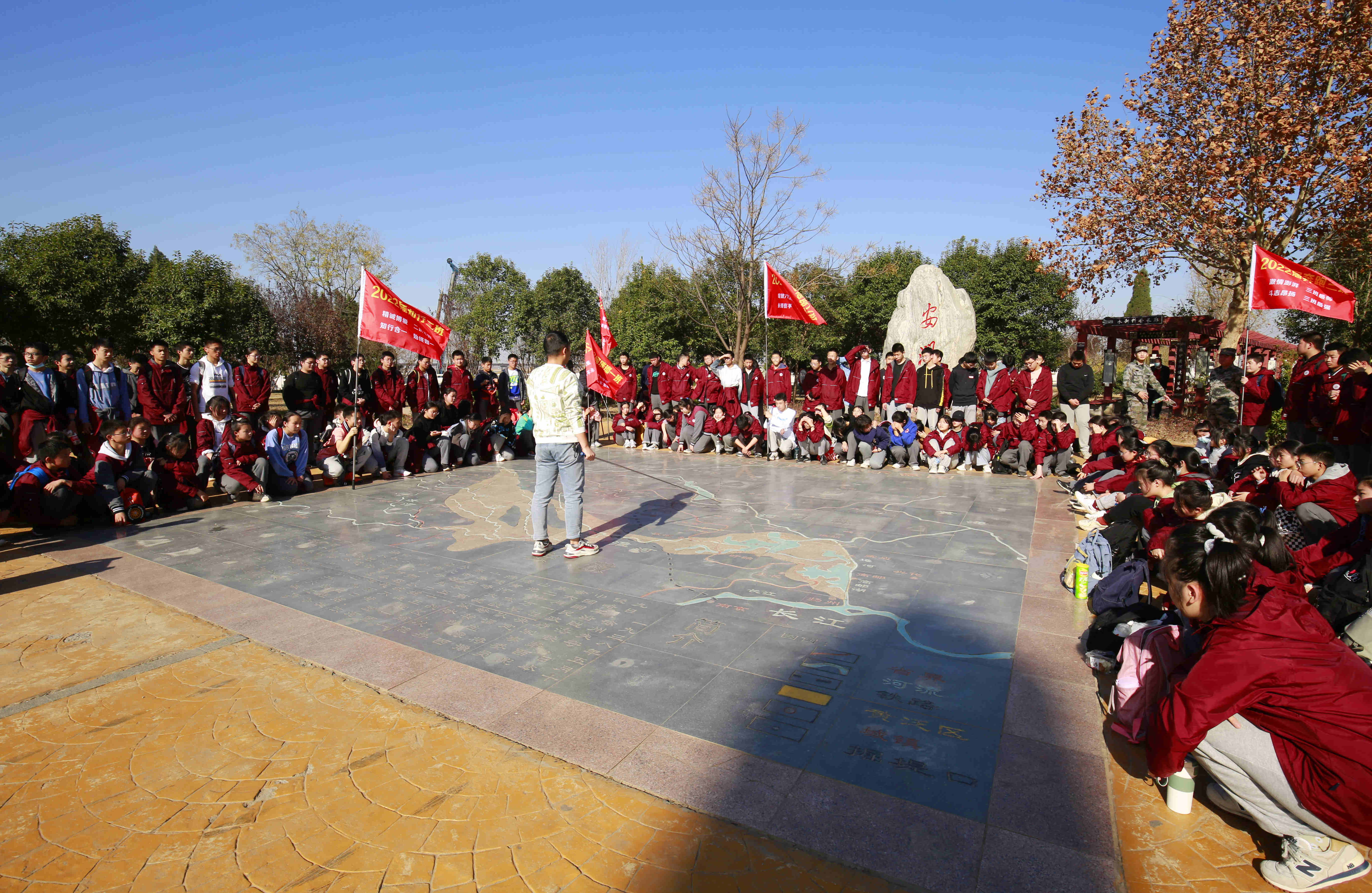 经过近4小时的徒步,师生抵达花园口记事广场。在老师的组织下,同学们首先学习了解花园口事件,进行爱国主义教育并结合学习内容,开展 “万里长城”项目拓展,明确责任与担当。